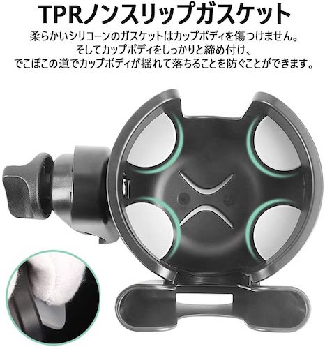 カップホルダー内側に4本のシリコン製すべり止めでボトル等が飛び出しにくい安心構造です。