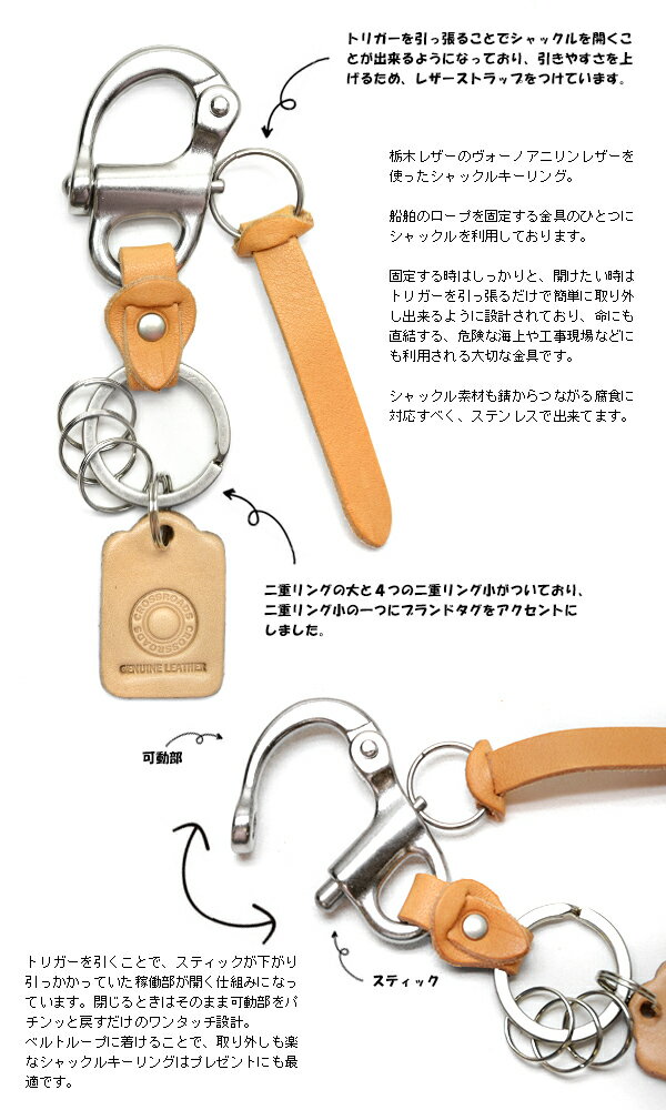 ■ブランド:CROSS ROADS(クロスロード) ■品名:Shackle Keyring(シャックル キーリング) ■素材 ・シャックル:ステンレス製 ・レザー部分:栃木レザー社製ヴォーノアニリンレザー ■サイズ ・シャックル部分:H51.5×W36mm ・製品全長:H140×W36mm ・レザー引き手:77mm ・重さ:58g ■カラー:タン・レッド・ブラウン・ブラック・キャメル・グリーン・ネイビー ■生産:HANDMADE in JAPAN (日本製)