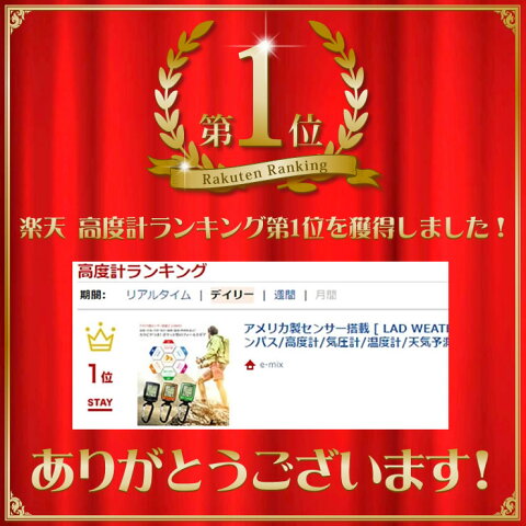 カラー01.新型ブラック02.新型オレンジ03.新型グリーン04.新型イエロー05.新型ワインレッド06.ブラック07.オレンジ08.スカイブルー09.イエロー10.ホワイト仕様駆動方式電池式表示方式デジタル表示裏蓋ネジ留め式防水日常生活機能■アメリカ製センサー搭載■ロック機能付きカラビナ付属■高度計・気圧を基に現在地の高度の計測計測範囲:-999 ? 9999 m / -2999 ? 19999 ft・高度の傾向を矢印で表示上昇/下降高度が1分間に8メートル以上の場合アイコンで表示・現在地の高度の修正・最高/最低高度の記録、表示・表示単位はm(メートル)とft(フィート)に対応■気圧計・現在地の気圧の表示計測範囲:800hPa ? 1099.9 hPa(mbar) / 23.63 ? 32.49 inHg・気圧の傾向を矢印で表示気圧の上昇/下降が15分間に0.8hPa以上の場合アイコンで表示・現在地の海面気圧の修正・最高/最低気圧の記録、表示・過去の気圧を自動記録・過去の気圧を数値で表示(1?12時間前のデータを表示)・過去の気圧をグラフで表示(1、2、3、6、12時間前のデータを表示)・表示単位はhPa mbar (ヘクトパスカル ミリバール)とinHg(水銀柱インチ)に対応■デジタルコンパス・方位(16方位)、方角(0°?359°)、矢印アイコンの表示・連続計測可能・キャリブレーション(センサーの偏りを修正)とデクリネーション(磁気偏差の修正)でコンパスの調整・修正が可能■気温表示・現在の気温を表示計測範囲:-10 ? 60℃ / 14 ? 140°F・気温の傾向を表示気温の上昇/下降が1分間に0.5℃以上の場合アイコンで表示・最高/最低気温の記録、表示・表示する単位は℃(摂氏)と°F(華氏)に対応■湿度計・現在の湿度を表示計測範囲:20 ? 99%・湿度の傾向を表示湿度の上昇/下降が15分間に2%以上の場合アイコンで表示・最高/最低湿度の記録、表示■天気予測・気圧の変化を元に、今後の天気を4つのアイコン(晴れ・晴れ時々曇り・曇り・雨)で予測■快適さの指標・気温、湿度を元に快適さをWET(多湿)、COMFORT(快適)、DRY(乾燥)の3段階で表示■時刻表示・時、分の表示・12時間/24時間表示切替可能■電池残量低下アイコン表示素材本体:ABSガラス:アクリルガラスカラビナ:アルミニウムサイズ全長:約12.3x4.4x2.3cm (縦x横x厚)本体サイズ:約5.6x4.4x2.3cm (縦x横x厚)カラビナ:約6.2x3.4x0.5cm (縦x横x厚)重量:約38g(本体のみ)、約47g(カラビナ含む)開口幅:約2cm新モデル全長:約12.3x4.0x2.0cm (縦x横x厚)本体サイズ:約6.0x4.0x2.0cm (縦x横x厚)カラビナ:約5.8x3.2x0.5cm (縦x横x厚)重量:約39g(本体のみ)、約47g(カラビナ含む)開口幅:約1.9cm付属品専用BOX取扱説明書(日本語)(こちらからダウンロードできます。