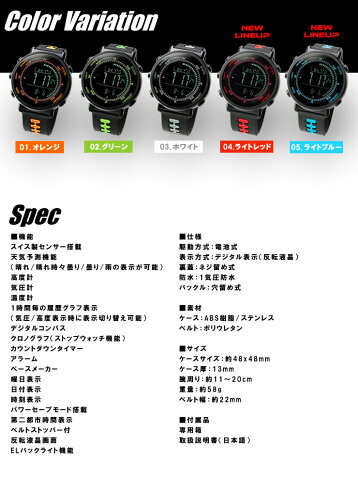メーカー希望小売価格はメーカーサイトに基づいて掲載していますLAD WEATHER ラドウェザー 腕時計 メンズ スポーツウォッチ アウトドア 限定モデル lad002カラー01.オレンジ:ブラック×オレンジ(文字盤・ベルト)02.グリーン:ブラック×ライトグリーン(文字盤・ベルト)03.ホワイト:ブラック×ホワイト(文字盤・ベルト)04.ライトレッド:ブラック×レッド(文字盤・ベルト)05.ライトブルー:ブラック×ブルー(文字盤・ベルト)仕様駆動方式電池式表示方式デジタル表示(反転液晶)裏蓋ネジ留め式防水1気圧防水バックル穴留め式機能■スイス製センサー搭載■天気予測・気圧の変化を元に、今後の天気を4つのアイコン(晴れ/曇り/晴れ時々曇り/雨)で予測■高度計・現在地の高度の計測・現在地の高度の修正・過去23時間の高度履歴をグラフで表示・履歴の確認(履歴時間とその時の高度の確認)■気圧計・現在地の気圧の表示・現在地の気圧の修正・過去23時間の海面気圧をグラフで表示・履歴の確認(履歴時間とその時の海面気圧の確認)・海面気圧の修正■デジタルコンパス・方位の表示・方角の表示・キャリブレーション(計測器具の偏りを修正する)、 ディクリネーション(磁気偏差を修正する)で コンパスの調整・修正が可能。