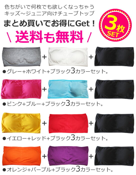 お得な3枚セット チューブトップ スポーツブラ パット付き 女の子 子供服 キッズ 無地 ブルー/ブラック/ピンク/イエロー/オレンジ/パープル/グレー/ホワイト/レッド ジュニア ダンス衣装 ヒップホップ チューブブラ ブラチューブ ベアトップ