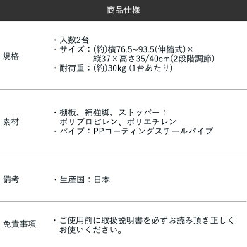 横幅は76.5〜93.5cmに伸縮、高さは35cmと40cmの2段階調整ができ、使う場所の広さや収納するものに合わせてピッタリ設置できます。