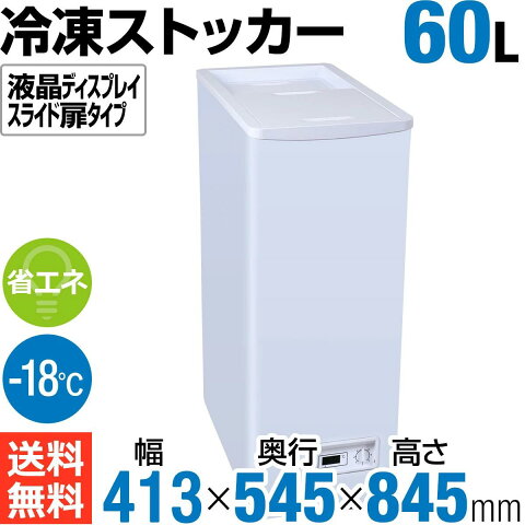 仕様 製品名 冷凍ストッカー60L 液晶ディスプレイスライド扉タイプ 型式 HJR-STF65 JANコード 4580014581093 外形寸法(幅×奥行き×高さ) 413×545×845(mm) 有効内容量 60L 重量 25kg 電源 単相100V(50/60Hz) 消費電力 80/90W 庫内温度 通常-18℃以下(外気温30℃ 無負荷直射日光を受けない状況下) 温度調節機能 あり 温度表記 液晶ディスプレイタイプ 外装 冷間圧延鋼板 スライド扉 ABS 付属品 霜取用ヘラ×1、排水キャップ×1 ご注意 ・庫内に食品以外を入れないでください。