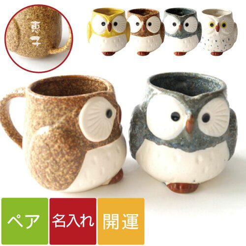商品情報 【名入れOK! 美濃焼 福来る開運ふくろうマグ ペアセット 300ml 】 ■縁起が良い鳥!ふくろうをモチーフにしたかわいいマグカップ! フクロウといえば、世界中で縁起が良い鳥! 日本はもとより、海外でも 「学芸と知性をつかさどる鳥(ギリシャ神話)」、 「先見の明を持つ賢い鳥(イソップ物語)」、 西洋では「知恵と信頼のシンボル」、 韓国においては、「招福の神」で家毎に フクロウ・ミミズク型の貯金箱を置いており、 日本の「招き猫」的な存在となっています。