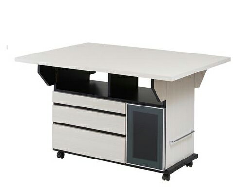 天板下スペースやサイドの雑誌・新聞収納など嬉しい機能満載!■商品の仕様/天板:ポリエステル化粧繊維板、前板:強化プリント紙化粧繊維板、扉枠:アルミニウム、3mm厚ガラス、その他:プリント紙化粧繊維板■商品サイズ/本体:(約)幅119.5×奥行(閉じ時)55(片バタ時)71(両バタ時)87×高さ70(キャスター含む)cm、扉部内寸:(約)幅23×奥行32×高さ37(可動棚奥行21)cm、引出し内寸:(約)幅(浅)52×奥行23.5×深さ4(有効4.5)cm、幅(中)52×23.5×8(有効8.5)cm、幅50×奥行23.5×高さ11(有効13)cm■付属品/キャスター5個(内2個ストッパー)付き■棚板/可動式1枚(3cmピッチ・3段階)■商品重量/(約)38kg■耐荷重量/天板(本体部):(約)20kg、天板(両バタ部):(約)10kg、可動棚:(約)5kg■日本製■完成品(キャスターのみ取付け)【配送について】●こちらの商品は配送日時の指定ができかねます。